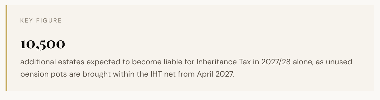 Inherited pension pots subject to IHT from April 2027 From April 2027, most unused pension benefits will be included in estate calculations for Inheritance Tax purposes. The OBR estimates this change alone will bring 10,500 more estates into IHT liability in 2027/28, rising to account for around 14% of total IHT receipts by 2030/31.
